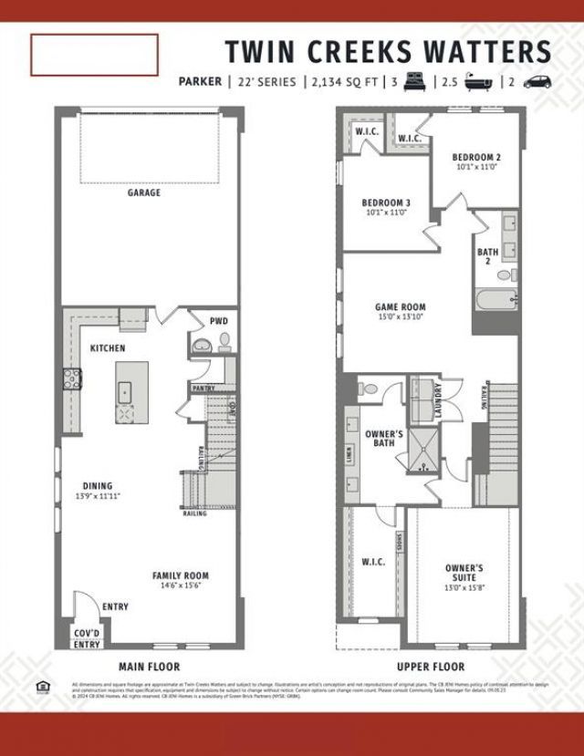 CB JENI HOMES PARKER floor plan. 2,134 sq ft, 3 bed, 2.5 bath breathtaking end-unit home-site townhome featuring 2 living areas—same floorplan as the Model Home! Stunning picture windows flood the home with natural light. Gourmet kitchen with huge island overlooks the dining and living areas—ideal for family gatherings and entertaining. Designer finishes include quartz countertops, luxury Revwood flooring throughout the entire first floor and plush carpet upstairs. The versatile upstairs family area offers the perfect space for a home office or game room. Spacious owner’s suite with a large walk-in closet and luxurious spa-like bath. Located in Twin Creeks Watters, in the heart of exemplary schools, dining, shopping, lakes, parks, and acclaimed golf courses. Enjoy low-maintenance living with modern elegance. Ready APRIL 2026!