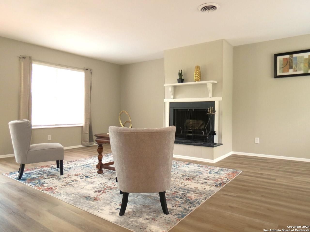 Completely updated and beautiful. New stainless appliances. New light fixtures. New door hardware. Inviting fireplace. New faux wood flooring in the living area, dining, and kitchen. New carpet in the bedrooms. Fresh paint inside and out. New 2 inch blinds and window treatments are included. New AC and heat system 2024. Mature trees. Neighborhood is gated and offers a community pool and clubhouse.