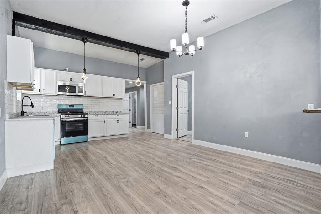 Fully remodeled and move-in ready, this 3-bedroom, 2-bath home offers a rare opportunity to own a character-filled property just minutes from Downtown Fort Worth—with owner financing available on fair terms. Originally built in 1930 and thoughtfully updated, this home blends classic charm with modern upgrades throughout. Inside, you’ll find an open-concept layout featuring luxury vinyl plank flooring, updated lighting, and a striking exposed beam that adds warmth and character to the main living space. The kitchen has been completely renovated with white shaker cabinets, granite countertops, subway tile backsplash, and brand-new stainless steel appliances—designed for both everyday living and entertaining. The spacious primary suite is complemented by two additional bedrooms, offering flexibility for guests, a home office, or rental potential. Both bathrooms have been fully updated with clean, modern finishes. Outside, the large backyard provides plenty of room for entertaining, pets, or future improvements, while the covered carport adds convenient off-street parking. Located in an area seeing ongoing growth and revitalization, this property is ideal for buyers looking for value, flexibility, and proximity to the heart of Fort Worth. Owner financing available—making this a strong option for buyers seeking alternative lending solutions or investors looking to expand their portfolio.
