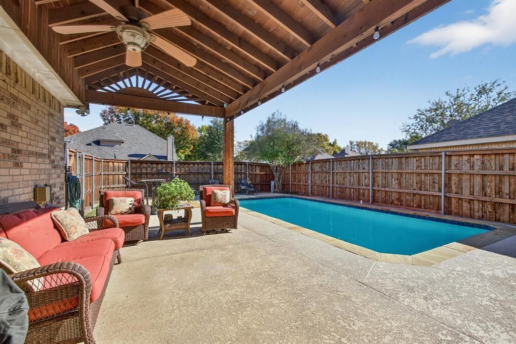 NEW ROOF February 11, 2026! Step into this beautiful, freshly painted home where soaring ceilings welcome you inside. The bright family room is filled with natural light and features a cozy gas fireplace with views of the backyard. The eat-in kitchen offers granite counters, stainless steel appliances, and a welcoming layout tailored to everyday dining.The private downstairs primary suite provides a peaceful retreat with dual vanities, a spa tub, and a separate shower. A convenient full bath on the main level is perfect for guests. A large office can also be used as a 5th bedroom or guest room. Downstairs AC was replaced in 2025. Upstairs, you’ll find three comfortable, spacious bedrooms, a full bath, and a versatile living area. Upstairs AC was replaced in 2019.Outside, enjoy family time or weekend entertaining on the covered patio overlooking the sparkling pool (resurfaced in November 2025). Your own backyard getaway to enjoy our long outdoor Texas seasons!