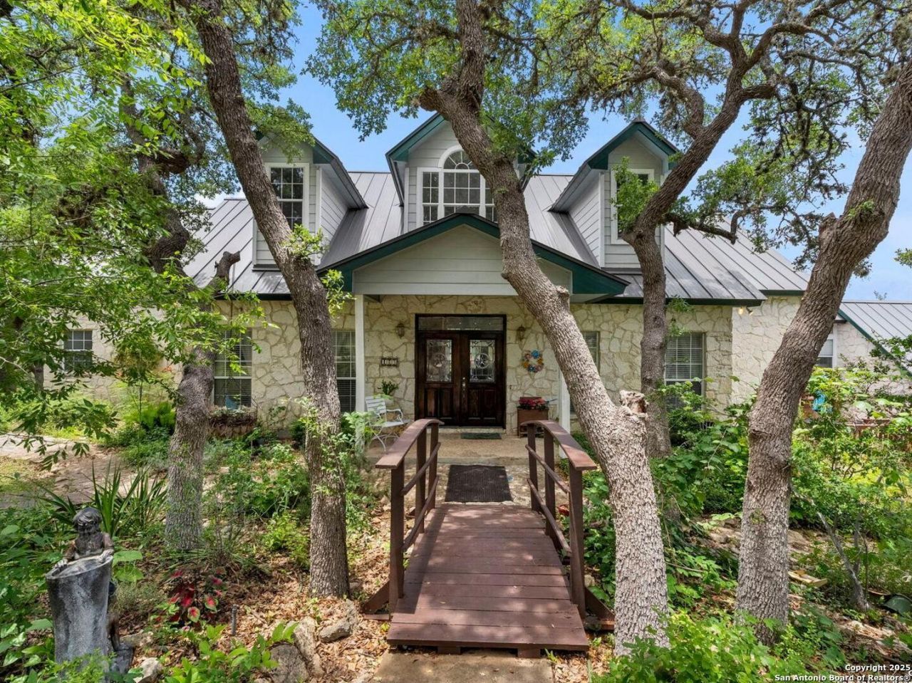 Perched atop a scenic hill overlooking the Medina River Valley, this stunning home is the ultimate Hill Country escape. Surrounded by mature trees and accessed through a gated entrance, this property offers the perfect blend of privacy, luxury, and unforgettable views. With 3.72 acres and over 500 feet of Medina Lake frontage, this is your opportunity to own a piece of Texas beauty. Inside, the elegant interior features soaring ceilings, a surround-sound system, a cozy fireplace, and windows that fill the living space with natural light. The chef-style kitchen offers ample cabinetry and room to prepare meals for a crowd. Step into the expansive primary suite, where a fireplace, bay windows, and private balcony access create a serene retreat. Upstairs, the loft area makes a perfect game room or second family room. Two additional bedrooms, each with attached bathrooms and access to the upstairs balcony complete the second floor. The attached guest quarters over the garage include a kitchenette-ideal for hosting weekend visitors or multi-generational living. Outdoor living takes center stage here, from the dual-level decks with scenic views and a surround-sound system, to the Medina Lake frontage with your own boat ramp and floating dock, to the shaded wooden seating area tucked under the trees. Whether youre searching for your forever home or a weekend getaway to create lasting memories with loved ones, this property delivers timeless charm, comfort, and an unbeatable lakeside lifestyle.