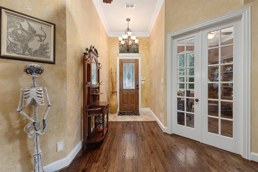 Beautiful one story 3400 square foot efficient home with Tesla solar panels & 3 Powerwall backup batteries in the highly sought after Lantana community. As you step inside, you'll be greeted by the warmth of rich hardwood floors. The study, featuring built-in shelving, provides a sophisticated space for working from home. Entertain in style with the built-in wet bar. The high ceilings in the living room add a sense of grandeur and openness to the space. The heart of this home is the expansive kitchen, with many cabinets, a gas stovetop and high-end appliances. The plantation shutters throughout the home not only add a touch of elegance but also allow you to control natural light effortlessly. For your entertainment needs, a dedicated media room awaits, providing an immersive experience for movies or watching the big game.