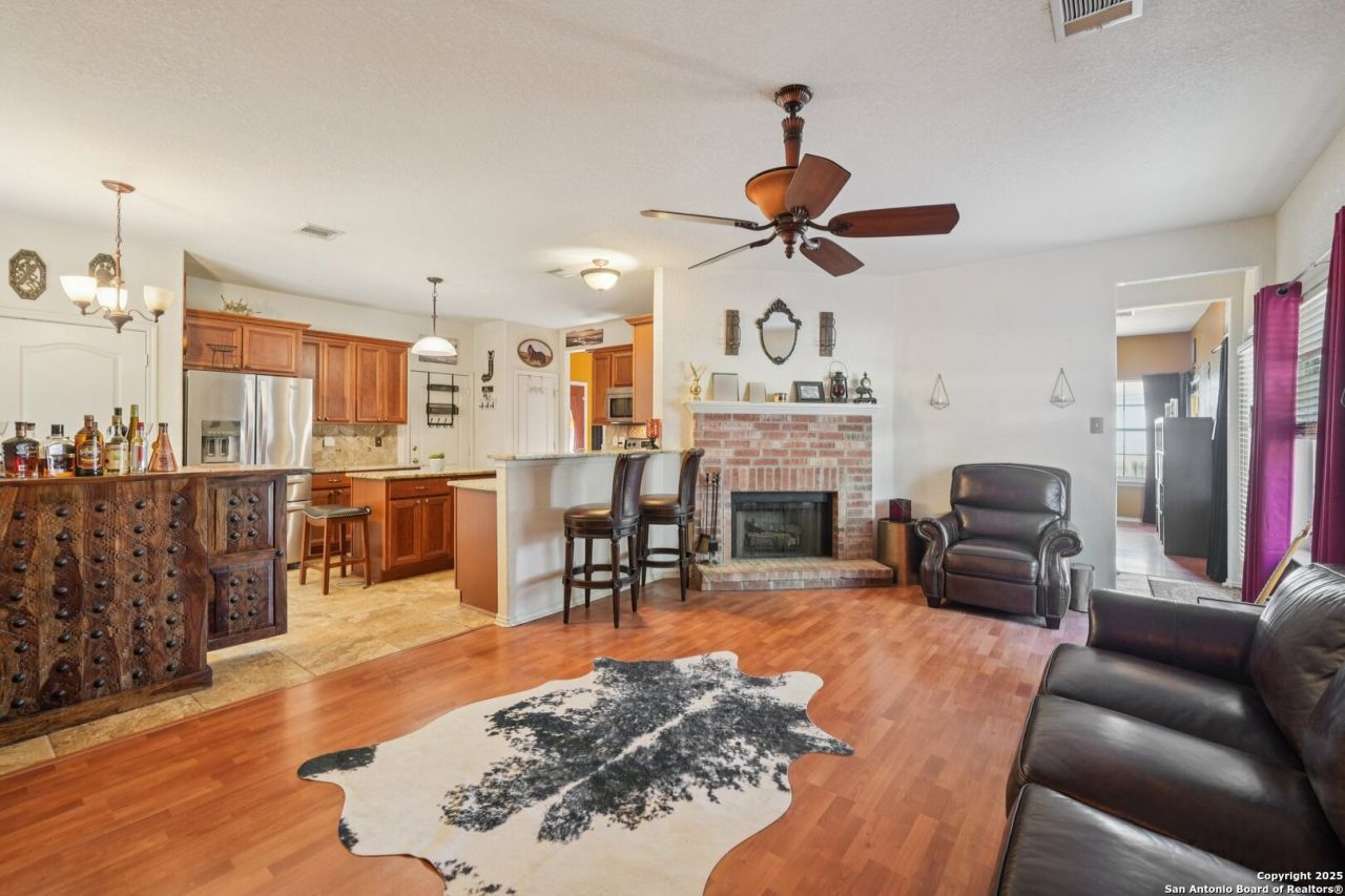 Brand new roof added ! Visit this stunning 4-bedroom, 2.5-bathroom residence in Universal City, boasting convenient access to highways, The Forum shopping, and the SAT airport expansion. This charming home blends musician flair with Austin-inspired vibes, perfect for entertaining. Featuring two living areas, a wood-burning fireplace, and tasteful tile and flooring, the propertys unique floor plan is ideal for social gatherings. The four upstairs bedrooms offer ample space, including a cozy nook in the master closet and primary bath, complemented by two closets.This home is sits on a corner lot and seperated 2 car garage ,a definite must see!