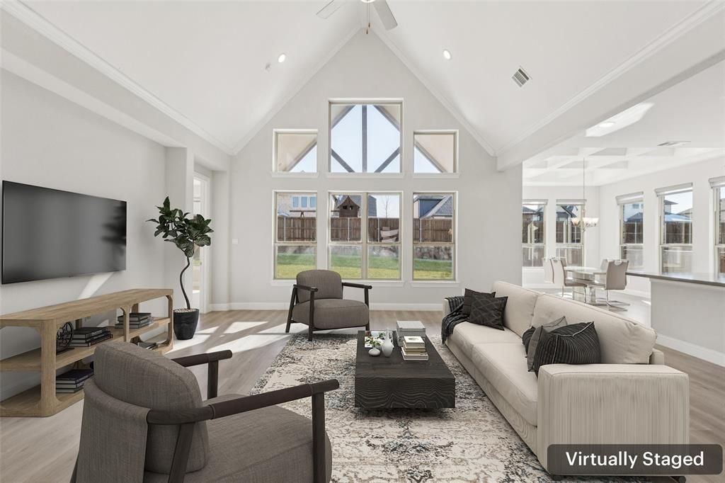 Stunning 4 bedroom, 3 bath Wylie home ready for you to make your own! This beautiful residence warmly welcomes you the moment you enter. At the heart of the home, the impressive living room showcases a soaring vaulted ceiling and a wall of windows that fills the space with inviting natural light. Vinyl flooring flows through the foyer, kitchen, and living area, complemented by recessed lighting throughout. The enviable eat-in kitchen is designed for both everyday living and hosting, featuring an extended island with seating, upgraded sink, built-in appliances, walk-in pantry, designer touches, and a bright breakfast nook with additional windows that enhance the natural light. The serene downstairs primary suite offers a spa-like ensuite bath with a soaking tub, separate shower, dual vanities, and a generous walk-in closet. An additional downstairs bedroom and full bath provide flexibility for guests or hobbies. Upstairs, two spacious bedrooms share a well-appointed bath. An elegant office with French doors creates an ideal work-from-home space or versatile flex room. Outdoors, enjoy a large private backyard with a covered patio, perfect for relaxing or entertaining. This north-facing home is ideally located within a community offering outstanding resort-style amenities, including a clubhouse, swimming pools, lazy river, two-story fitness center, pickleball courts, and dog parks. A wonderful opportunity in a highly desirable location—don’t miss it! 3D tour available online!