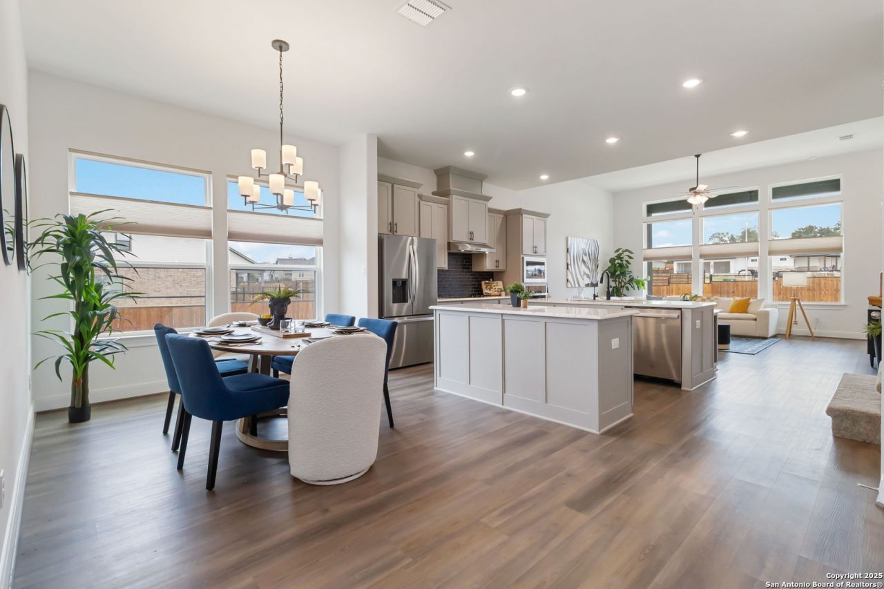 Open house 3/21 12pm-3pm. Better-than-new gated community Woodbridge Farms home with premium upgrades including Tesla charger, whole-house water filtration, reverse osmosis system, new fencing, and included appliances and window coverings. Built in 2023, this 4-bedroom, 2.5-bath home offers 2,537 sq ft on a spacious 0.3-acre lot with modern finishes and open-concept living. Light-filled interior with functional layout, large kitchen, and generous living spaces ideal for everyday living and entertaining. Located in a desirable gated community with low HOA, this move-in-ready home provides comfort, efficiency, and added value compared to new construction. Soaring ceilings and an abundance of natural light flood this home. Dream kitchen with upgraded appliances including flat cooktop, built-in oven, microwave, dishwasher and refrigerator. Walk-in pantry, double islands with breakfast bar and tons of storage that is highlighted by custom woodwork and built-ins. Separate dining area that is perfect for hosting parties and meals. The open concept flow and large picture windows in the living area make enjoying your backyard view a breeze. Versatile downstairs space perfect for dedicated home office, cozy den or 5th bedroom. The split primary bedroom is located downstairs providing privacy and features bay windows, coffered tray ceiling with a ceiling fan, and plenty of space for relaxation. The primary bath offers upgraded designer tile flooring, spacious shower, soaker tub, dual sink vanity, framed mirrors, and a huge walk-in closet. The home boasts an expansive upstairs bonus room as well as a separate built-in media area for studies or crafts. Secondary bedrooms with large walk-in closets and a spacious bathroom. Phenomenal laundry room with large storage area. Corner lot, custom privacy fence, and the covered patio will have you enjoying the great outdoors. Conveniently located near the splashpad and park. This gorgeous hill country master-planned community has been thoughtfully landscaped with sidewalks, multiple parks, splash pad, basketball court and more. We invite you to embrace the pride of La Vernia and the traditions of living in the South! Call today before this one gets away!!