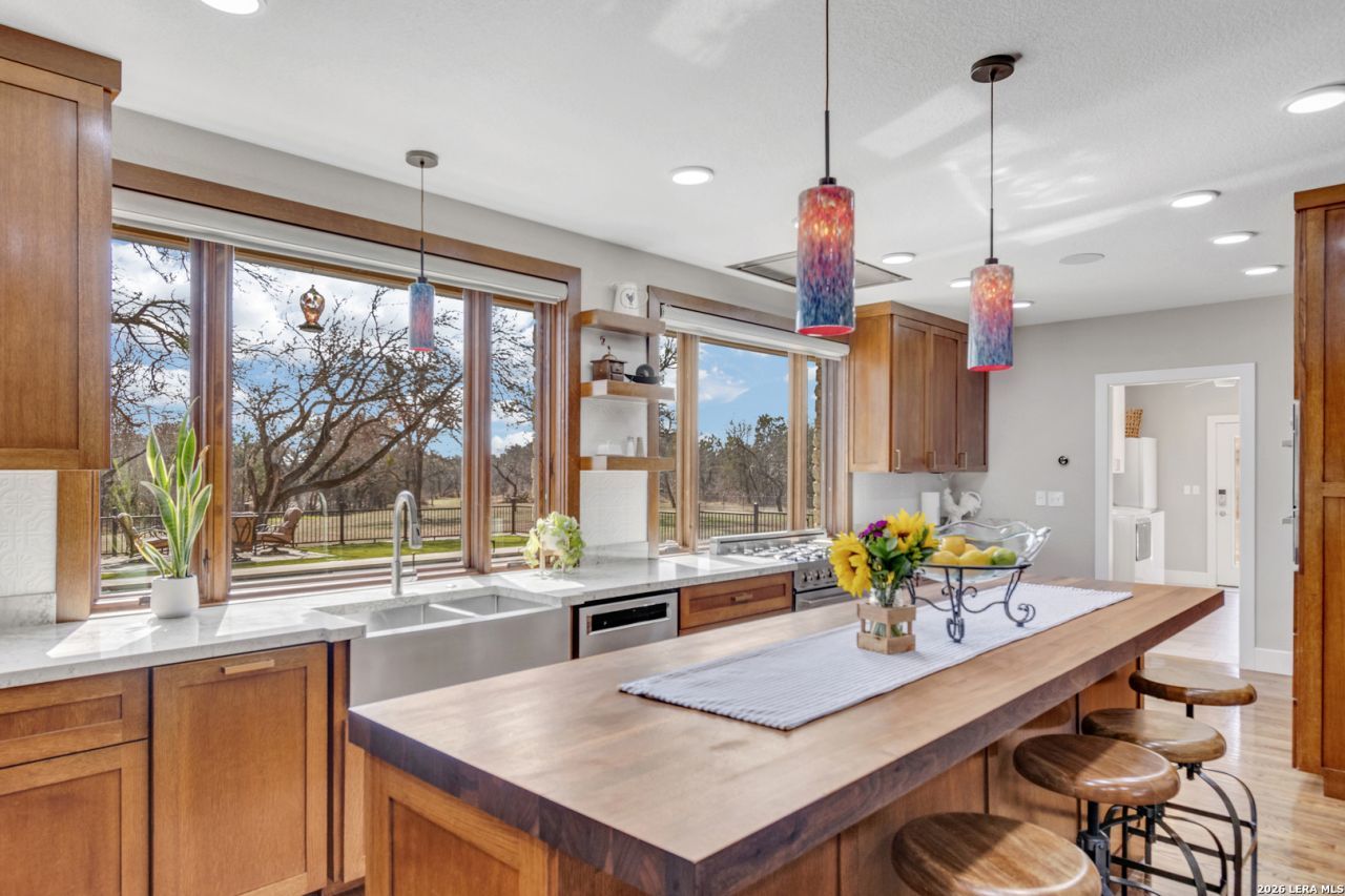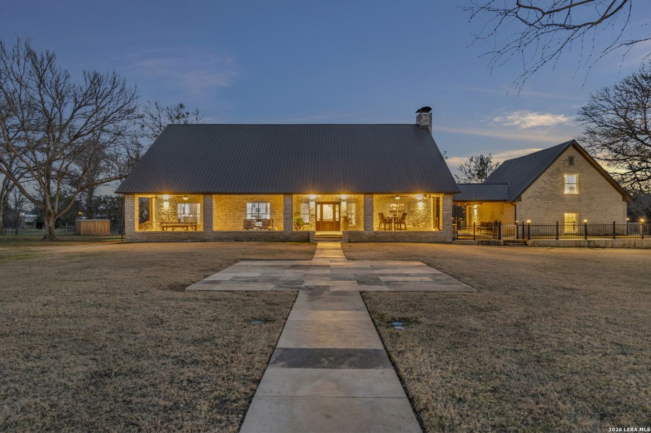 At the end of a quiet cul-de-sac, a secure privacy fence welcomes you to this stunning estate. Entering, youre greeted by a timeless windmill, a nod to the lands heritage and the old wagon trail that once crossed here. Set on nearly seven oak-studded acres, this all-stone Hill Country estate has been thoughtfully updated throughout. Custom cabinetry enhances nearly every space in the home, which features 3 bedrooms and 31/2 baths. The kitchen, overlooking the pool, boasts electric blinds, high-end appliances, a premium range with double ovens, and a built-in espresso machine, a chefs dream. On the west end, the private office features a fireplace and a floor-to-ceiling custom cabinet system, plus a Murphy bed for guests. Step outside to discover a private retreat with a 2020-built pool, hot tub,and sauna, all surrounded by low-maintenance turf. An expansive front porch and charming breezeway provide perfect spots for relaxation, while a half-court basketball area offers fun for all. Separate from the main home is a dedicated game room and a private studio apartment with 1 bedroom and 1 bath. The barndominium includes imported Italian laminate flooring, 1 bedroom, 11/2 baths, and a laundry room for guests. Upstairs, a flex space awaits. The impressive 40x40 storage/shop area with epoxy-finished floors is on the north end of the barndo. A garden area with a tool shed and a large dog run complete this exceptional setting. With most furnishings negotiable, this luxury estate is a true gem.