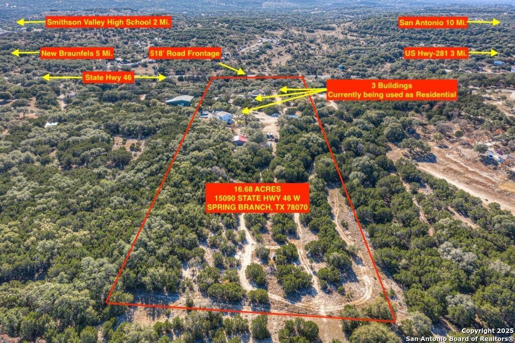 Approximately 16.68 acres of prime land ideally located along the north side of Highway 46, between Highway 281 and FM 3159. The property sits near Smithson Valley High School and is just minutes from the Highway 281/46 intersection and the growing Singing Hills Development, placing it in the path of strong growth. The site offers approximately 518 feet of frontage on Highway 46, providing excellent visibility and access. It is well suited for an owner/user, redevelopment opportunity, or a long-term buy-and-hold investment. The property is located outside city limits and is unrestricted, while still falling within the Bulverde ETJ. Improvements include three existing homes totaling approximately 4,993 square feet (1,948 SF, 1,425 SF, and 1,620 SF), along with multiple garages and storage sheds, offering interim income or flexible use during future development.
