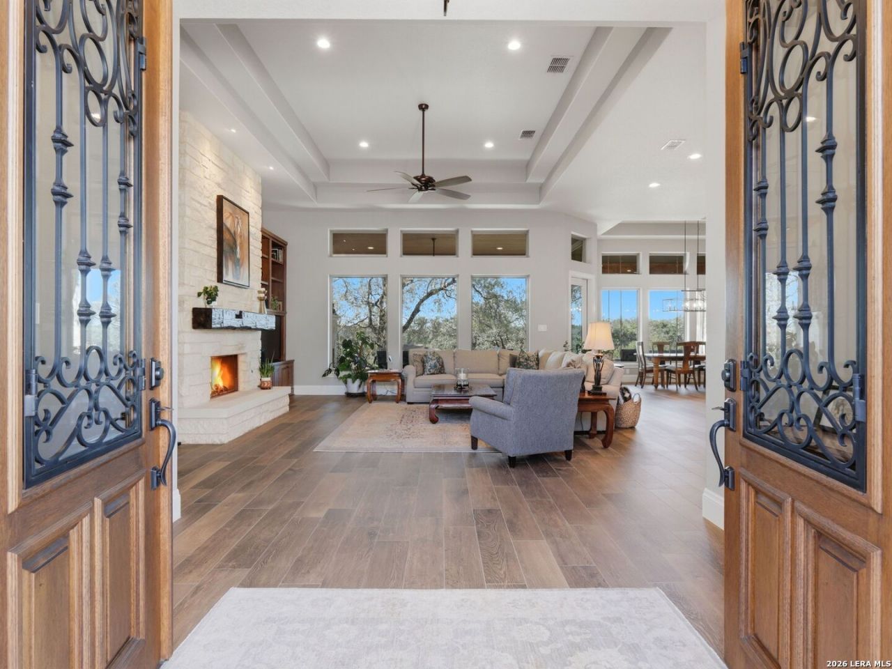 Perched along a scenic ridgeline and nestled privately within 5 serene acres, this custom-built Hill Country retreat offers breathtaking views, abundant wildlife, and exceptional privacy. The home showcases beautiful finishes throughout, including quartz countertops and plantation shutters, while expansive windows fill the interior with natural light and frame the surrounding Hill Country landscape. The spacious covered back patio with outdoor fireplace extends the living space outdoors - an ideal setting for morning coffee as the sun rises over the hills, relaxed evenings by the fire, and gatherings with friends while watching deer and native wildlife. The professionally xeriscaped grounds feature native plants that complement the natural setting while providing low-maintenance beauty. Additional features include a 3 car garage with one bay configured as a workshop, a detached 20 x 26 detached building with carport, fenced backyard, standing seam metal roof, solar panels and a 26 kw generator for efficiency and peace of mind. Properties offering this level of privacy, views, and thoughtful design are rare - come and experience the beauty and tranquility of Hill Country living for yourself.