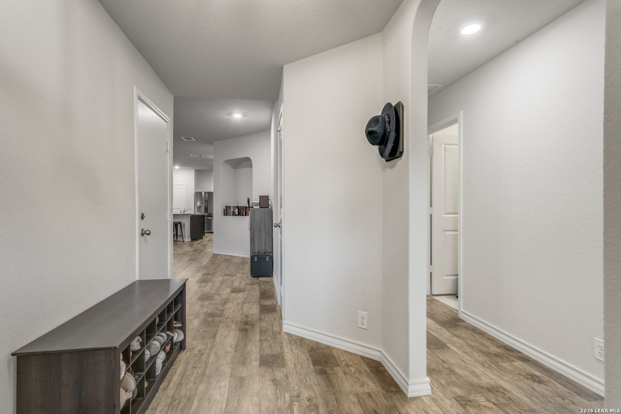 This beautifully maintained single-story home in Redbird Ranch offers a well-designed layout with 4 bedrooms, 2 bathrooms, and 1,898 square feet of comfortable living space. The open-concept floor plan creates a natural flow between the living, dining, and kitchen areas, enhanced by high ceilings and luxury vinyl plank flooring throughout the main living spaces. The kitchen is both functional and inviting, featuring an oversized island with breakfast bar seating, granite countertops, subway tile backsplash, stainless steel appliances, and gas cooking. The primary suite is privately positioned at the back of the home and includes a spacious walk-in closet and an ensuite bath with dual vanities, a garden tub, separate walk-in shower, and private water closet. Secondary bedrooms are well-sized and offer flexibility for a variety of needs. Additional features include a dedicated laundry room, attached 2-car garage, water softener, refrigerator, full sprinkler system, and ceiling fans in select areas to enhance comfort. The covered patio overlooks a generously sized backyard with ample space for outdoor enjoyment, entertaining, or personal customization. Located within Medina Valley ISD with convenient access to Potranco Rd and SH-211, the home is near shopping, dining, and major employers including Lackland Air Force Base. Redbird Ranch offers a variety of community amenities including pools, parks, playgrounds, sports courts, and walking and biking trails. The home also includes the remaining builder 10-year structural warranty, providing added peace of mind.