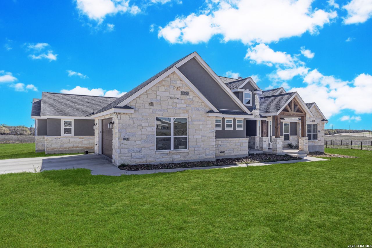 Beautiful 4-bedroom, 2.5-bath home situated on a spacious 1.22-acre cul-de-sac lot in the heart of La Vernia. Offering 2,541 sq ft of thoughtfully designed living space, this home features soaring 12-foot tray ceilings, elegant porcelain tile flooring, and an open-concept layout ideal for everyday living and entertaining. The chefs kitchen is a standout with granite countertops, custom backsplash, walk-in pantry, and a striking architectural archway that adds character and charm. The private owners suite provides a relaxing retreat with a double vanity and beautiful tumbled stone walk-in shower in the en-suite bath. Enjoy the dog shower in the utility room to keep your furry friend clean! Step outside to the covered patio overlooking wide open space, perfect for relaxing evenings, weekend gatherings, or simply enjoying the peaceful surroundings. This beautifully maintained property offers comfort, style, and plenty of room to grow.