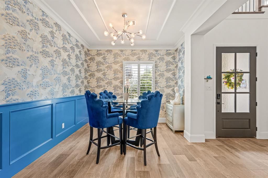 Stunning home in highly sought-after Walsh, featuring designer lighting, custom wallpaper, and a thoughtfully designed layout. Off the foyer, you’ll find a formal dining room to the right and a private office to the left. The open-concept living area features glass sliding doors that seamlessly connect to the private outdoor living space, complete with a fireplace, heated pool and spa, outdoor shower, and mature magnolia trees that create a serene backyard retreat. The home backs to a peaceful greenbelt, providing added privacy. Perfect for entertaining, the eat-in kitchen offers a large center island and high-end appliances and opens to the spacious living room with built-ins and a fireplace. The first-floor owner’s retreat features a spa-like bath and dual walk-in closets, while a guest suite with its own private bath is also located on the main level. Upstairs includes a game room with wet bar, media room, additional sitting area, and two bedrooms with two full bathrooms. Additional features include UV lights in the HVAC system, a whole-home air scrubber, and two humidifiers. Recent updates include a glass fence along the back patio, a new Bosch dishwasher, and floor-to-ceiling bookshelves in the upstairs bedroom and sitting area. Enjoy easy access to Walsh amenities including a fitness center, resort-style pool, sports courts, multiple playgrounds, miles of walking trails, a private lake, dog park, neighborhood market, and fuel station.