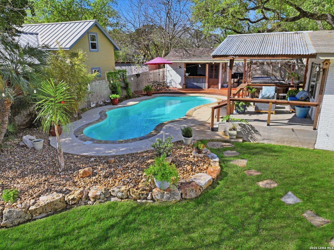 Welcome to a rare opportunity to own this stunning, extensively updated single-story home in a highly sought-after neighborhood (On the Hill) in New Braunfels. Homes like this are hard to find in such a well-established and desirable neighborhood! Ideally located within walking distance to Landa Park and Panther Canyon, this stylish and sleek home offers the perfect blend of comfort, convenience, and outdoor living. Built in 1966 and featuring approximately 1,488 square feet, this thoughtfully improved single-story residence includes 3 bedrooms and 2 bathrooms, with many upgrades throughout. Inside, you will find a spacious family room that flows quite well with the kitchen and breakfast nook. In addition, the adjoining flex room can be a formal living room, office or dining room...you decide! You will also find beautiful wood flooring in all bedrooms and living spaces, refinished cabinetry with new doors and hardware, and stunning quartz countertops in both the kitchen and bathrooms. Fresh interior paint adds a clean, modern feel, while additional updates include a newer dishwasher, newer water heater, and a newer water softener system. Step outside and enjoy your own private Texas retreat on an oversized .35 acre lot! The yard is an entertainers dream with mature trees, lush grass, a resurfaced in-ground pool with a newer pump, a newer hot tub, a wood deck, and a covered outdoor cooking area-perfect for hosting gatherings year-round. An exterior fire pit adds even more charm and ambiance for relaxing evenings under the stars. The backyard shed has been modified to a pool style bar on one side and a covered grilling station on the other, and still has a small storage area for all of your landscaping and gardening tools. The yard is so large there is even room to add a pickleball court or large garden! This is truly a rare, move-in-ready home in one of New Braunfels most popular and established neighborhoods-offering a lifestyle thats hard to match. Dont miss your chance to make it yours!