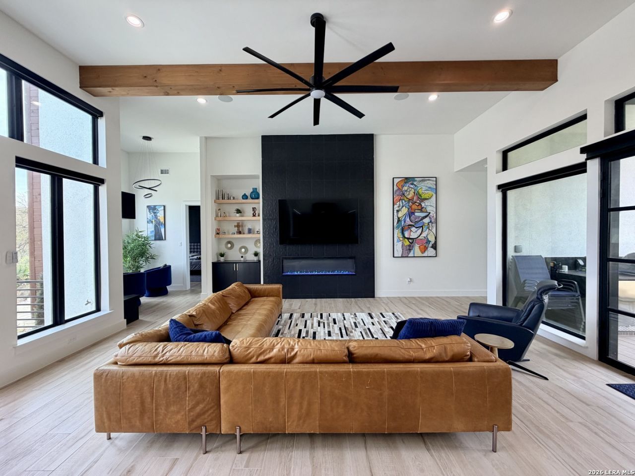 Stunning Modern Luxury Home in Gated Terra Mont Community Experience modern luxury at its finest inside the highly coveted 24-hour gated Terra Mont neighborhood. This custom-built residence was thoughtfully designed to capture and showcase the breathtaking views overlooking the lush green belt. Step inside to discover a spacious open-concept floor plan featuring 5 bedrooms, 3 full baths, 2 half baths, and a 3-car garage, along with a versatile game room and wrap-around terrace. The split floor plan offers exceptional privacy, with the primary suite and gym situated on one wing of the home. Soaring 13-foot ceilings in the living room, kitchen, and dining area create a grand sense of space and light, perfect for both everyday living and entertaining. The chefs kitchen is a true focal point, boasting high-end JennAir appliances, including a 48-inch gas range and 48-inch built-in refrigerator. A hidden walk-in pantry adds to the kitchens seamless, modern aesthetic. On the opposite side of the home, youll find three guest bedrooms. One bedroom features a private ensuite bath, ideal for guests, while two others share a Jack-and-Jill bathroom - each with generous closet space. Upstairs, the game room/bonus room provides an inviting entertainment space complete with a built-in bar area. Step out onto the wrap-around terrace to enjoy panoramic neighborhood and hill country views. The outdoor living area is designed for both relaxation and fun, featuring a fully equipped outdoor kitchen with a built-in Coyote grill, a basketball court, and ample green space for recreation. With nearly three-quarters of an acre, theres plenty of room to add a cabana, firepit, or even a pool to create your dream backyard retreat. This remarkable home combines sophisticated design, premium finishes, and exceptional functionality, making it a true luxury haven in one of Terra Monts most desirable locations.