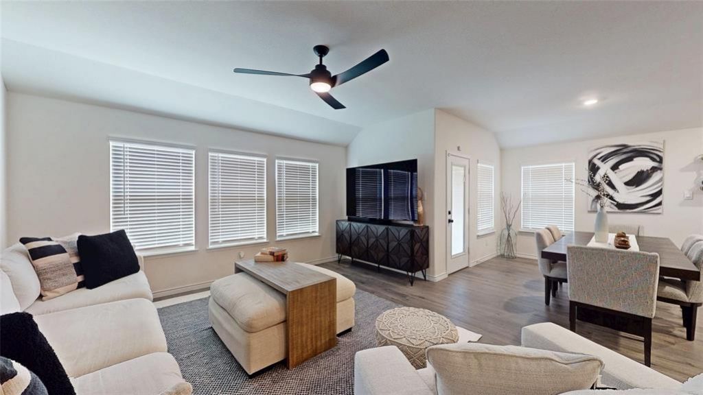 Meticulously maintained single-story on a corner lot with beautiful brick and stone elevation! Built by DR Horton, this sprawling plan offers 4 bedrooms, 2 full baths, open-concept living and kitchen area perfect for entertaining, and 2-car garage! Upgrades and amenities include gorgeous luxury vinyl flooring flowing throughout main living areas with plush carpeting in all bedrooms, upgraded door knobs, faucets, and added ceiling fans throughout, neutral paint tones, an abundance of natural lighting throughout, split bedrooms for added privacy, generous storage space, and MORE! Spacious kitchen offers dark wood cabinetry, quartz countertops and backsplash, large waterfall island with breakfast bar, stainless appliances including a gas range, and adjacent dining area. Primary bedroom secluded at the rear of the home offers a luxurious ensuite bath with dual sink vanity, shower with bench seat, and huge upgraded walk-in closet that mirrors the model home! Private backyard is complete with an expansive Trex decking patio and recently stained 8ft fencing!