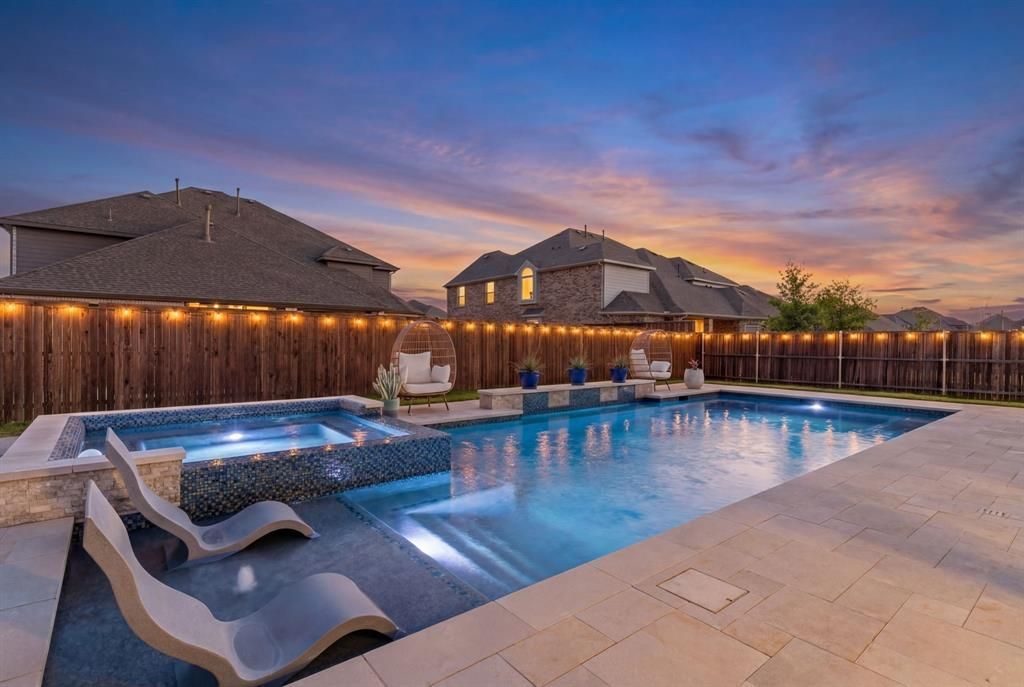 *** $10,000 ALLOWANCE*** to buyer with acceptable offer! Absolutely stunning NORTH facing home located in the highly sought-after Creeks of Legacy, zoned to highly acclaimed Prosper ISD schools! This spacious residence offers 5 bedrooms, 4 full bathrooms, a 3-car garage, and a gorgeous, recently completed pool and spa that truly elevates the backyard experience. From the moment you walk through the front door, you’re welcomed by soaring ceilings and a beautiful curved staircase that makes a grand first impression. Downstairs features a large private office with French doors, an elegant formal dining room with tray ceiling, and a bright open living room and kitchen filled with natural light. The primary suite showcases charming curved windows and a spacious ensuite bath designed for relaxing after a long day. A secondary bedroom with a full bathroom downstairs makes the perfect setup for overnight guests. Upstairs, you’ll find a generous game room with access to the front balcony, three additional bedrooms, two full bathrooms, and a media room complete with a large closet and wet bar that could easily serve as a sixth bedroom. The backyard is a true paradise featuring a large covered patio with a cozy fireplace overlooking the sparkling pool and spa! Why wait to build when this one is already done for you? Creeks of Legacy offers incredible amenities including community pools, a fishing pond, amenity center with gym, parks, walking trails, and family-friendly events throughout the year. Conveniently located near shopping, dining, and entertainment, this is your opportunity to become part of an amazing community!