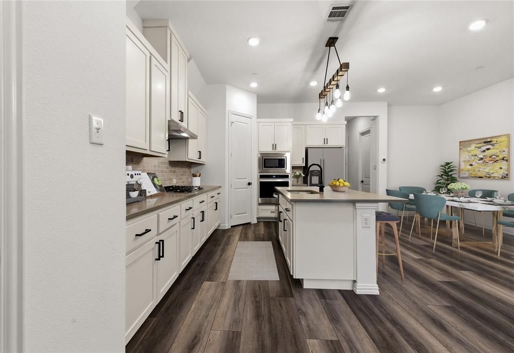 Built in 2021 by Ashton Woods, this beautifully finished townhome in The Station offers a smart, functional layout with modern finishes throughout. The first floor features luxury vinyl plank flooring and an open living-dining layout centered around a well-appointed kitchen with white shaker-style cabinetry, quartz countertops, a gas cooktop, and generous prep and storage space. Upstairs, the spacious primary suite includes a well-appointed bath with dual sinks, private water closet, and large walk-in closet. Two additional bedrooms, a full bath, and a versatile flex space—perfect for a study, playroom, or second living area—complete the second level. Ideally located along the President George Bush Turnpike, residents enjoy quick access across the metroplex including Firewheel, Downtown Dallas, Legacy West, and the Dallas North Tollway, along with nearby parks, shopping, dining, and entertainment.