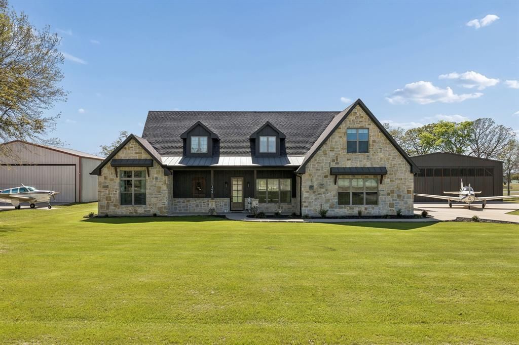 Aviation Lover's Dream: Immaculate 5-Bedroom Home & Hangar on Runway Lot! Discover your haven at Tailwind Airpark with this IMMACULATE newer construction home featuring five bedrooms & three baths, located on a sprawling 1.142-acre runway lot at Thompson Field (FAA Identifier 1TA7). Perfect for aviation enthusiasts, this property offers direct access to a 2500 ft paved runway with a 1400 ft grass overrun, with the added convenience of on-site 100LL fuel. Step inside to an open concept home design awash in natural light. High-end finishes include quartz countertops & custom roller shades complementing the stylish & energy-efficient Low-E windows. Add'l energy efficient features include radiant barrier roof decking & sellers spent $5000 upgrading insulation. The living area boasts grand cathedral ceilings, hand-scraped hardwood floors & a spacious kitchen with large island & breakfast bar, all overlooking the serene backyard & runway. The thoughtfully designed layout features a remote primary bedroom suite with a luxurious en-suite bath showcasing dual vanities, a standalone soaker tub & a luxury tiled shower. 2 add'l bedrooms are located on the main floor, while upstairs a flexible space can serve as a 5th bedroom or game room. The exterior does not disappoint with a covered patio, perfect for watching aircraft come & go. Expansive backyard dotted with mature trees, is meticulously groomed with stylish landscaping. Just steps away, is the 50ft wide x 40ft deep airplane hangar with sizable concrete apron, constructed with red iron metal makes it extremely desirable for most aircraft & RV’s! Equipped with FoldTite manually operated vertical accordion doors, electricity & sleek LED lighting. The hangar door opening is 39.5ft in width when all doors wide open with 14ft tail height clearance on the door opening. This unique property airpark property is just minutes from the famous First Monday Canton Trade Days & I-20. No HOA! Make this unique aviation haven your own!