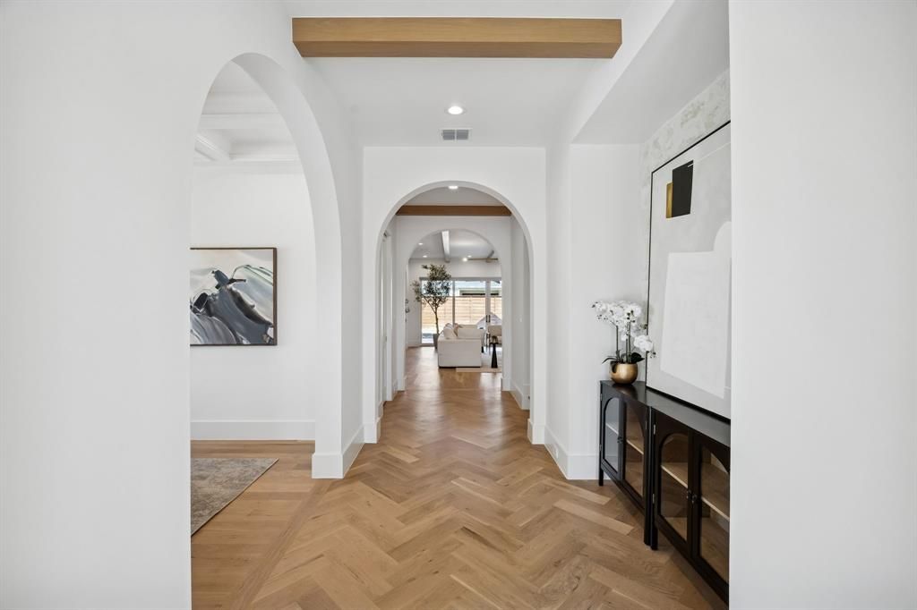 Built by BuildTX and designed by CH Design Studio, this contemporary modern 5-bedroom, 5.1-bath residence spans over 4,550 square feet of thoughtfully designed living space. The entryway welcomes you with stunning white oak herringbone flooring, setting the tone for the architectural details found throughout the home, including stone carried in from the exterior to frame the living room fireplace and a dramatic accent wall just off the entry. The main level also features a dedicated study, ideal for working from home. A formal dining room with elegant coffered ceilings is perfect for entertaining, while the butler’s pantry leads into a chef’s kitchen equipped with Monogram appliances and quartzite countertops. The living room flows seamlessly to the backyard through Pella sliding doors and includes a wine cellar with storage and refrigerator, perfect for showcasing your collection. The spacious laundry room offers a full-size washer and dryer area along with a dedicated folding counter. The primary bathroom is the true focal point of the home, featuring dual vanities, beautiful marble countertops, and elegant tilework that extends into the shower and soaking tub, creating a spa-like retreat. Upstairs, four additional bedrooms complete the layout, including two connected by a Jack-and-Jill bath. One bedroom features an attached patio, offering an indoor-outdoor feel during pleasant weather. The upper level is completed by a light-filled game room overlooking the front of the home and additional flex space ideal for a second office or workout room.
