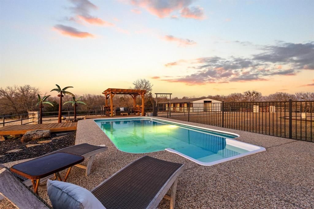 OPEN HOUSE ~ Sat. 3.14.26, 2pm-4pm ~ Experience the ultimate Texas sunset from this private 18+ acre oasis. Whether you’re soaking in the hilltop pool, unwinding on the expansive patio, gathered around the firepit, or relaxing in the hot tub, you’ll enjoy evening panoramic vistas that put you front-row to the best show in North Texas.Bathed in natural light & curated with impeccable style, this breathtaking home offers sweeping views that create the perfect backdrop for everyday living. Designed for seamless indoor-outdoor flow, the open-concept layout centers around a striking stone fireplace, creating a warm, inviting atmosphere that opens effortlessly to multiple outdoor entertainment spaces. The kitchen offers endless counter space & large island with seating making hosting a breeze, flowing into a dramatic dining area with soaring ceilings & a picture window frames stunning pool & ranch views. The home was originally designed as a three-bedroom & has been thoughtfully converted to a spacious two-bedroom layout, enhancing the living areas while maintaining comfort & functionality. Two generously sized bedrooms & two full baths provide quiet retreats to end the day. Detached flex space offers excellent versatility & would make an ideal home office, gym, studio, or creative workspace. The courtyard extends across the back of the home, leading to a hot tub, sauna, & fenced pool area—perfect for relaxation & entertaining. Outdoor amenities include a covered RV area with water and a 50-amp hookup & designed to be easily converted into a full-size pickleball court, an impressive six-stall metal barn with wash rack, tack room, electricity, & water, plus a nearby corral with water access. Pastures are fenced & cross-fenced, complemented by a stock tank & mature trees. Currently ag-exempt, this ranch is comfortable, functional & ready for your livestock. This isn’t just a ranch—it’s a lifestyle.