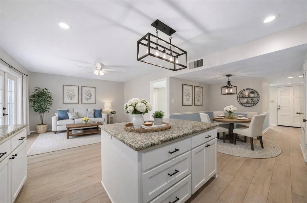 Updated and move-in ready! This beautiful single-story home in Coppell offers a light-filled interior, stylish finishes, and a functional open-concept layout. The gorgeous updated kitchen features crisp white cabinetry, granite countertops, a classic herringbone backsplash, black hardware and fixtures, generous counter space, eat-in breakfast area, and kitchen island overlooking a second living area; a perfect layout for everyday entertainment and enjoyment. Wide-plank wood-like vinyl flooring and soft neutral tones flow through the main living spaces. The spacious family room showcases a brick fireplace and opens seamlessly to the formal dining area and kitchen. French doors lead to a nice back patio, covered patio, and oversized backyard with plenty of room to relax, entertain, or play and for pets. With attractive curb appeal and thoughtfully updated interiors, this home is ready to enjoy and offers quick access to dining and shopping! New sprinkler system front and back. New windows (previous owners had replaced a few, current sellers replaced others) Virtual tour and colored floorplan available!