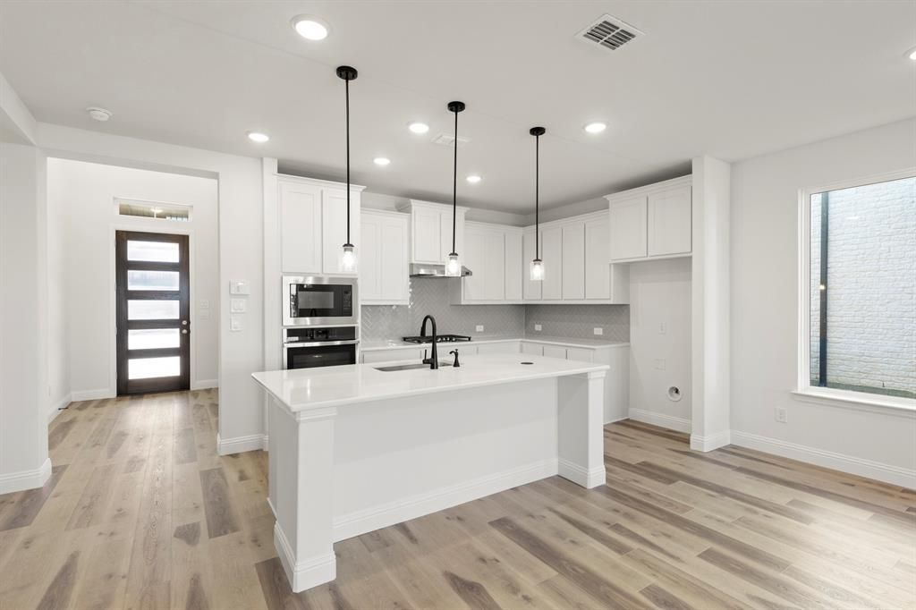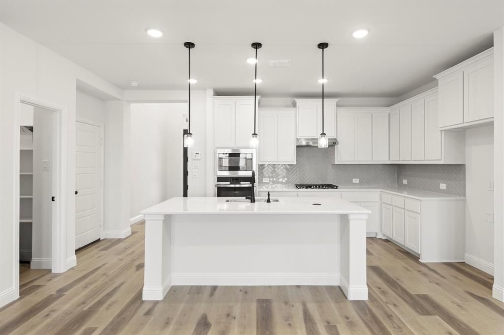 MLS# 21071804 - Built by Pacesetter Homes - Ready Now! ~ This 4-bedroom, 3.5-bath Prosper ISD home has plenty of room for everyone with a layout that works for everyday living and entertaining. The main floor features a spacious family room that opens to a bright kitchen with white shaker cabinets, quartz countertops, GE stainless appliances, gas cooktop, and built-in oven and microwave. You'll love the little details like the pull-out trash drawer, deep pot and pan storage, and pendant lighting over the island. The primary suite is tucked away on the main floor with a large walk-in closet plus a glass-enclosed shower. The private guest suite downstairs is perfect for visitors or in-laws. Upstairs, the fun begins with a spacious game room featuring a pop-up ceiling and a media room with double doors, making movie nights and game days a lot more fun. Two more bedrooms plus a bathroom round out the second floor. With luxury vinyl plank flooring in the main living areas, open railing, matte black fixtures, and a light brick and stone exterior, this home blends style and curb appeal in all the right ways. Your Pacesetter Home comes equipped with a suite of smart features designed to enhance everyday living.-Ring Video Doorbell-Brillant Smart Home System to control lighting and music-Honeywell Smart T6 Thermostat for energy savings-WiFi-enabled Garage Door-Rainbird Wifi-capable Sprinkler System Plus, enjoy added support with White Glove Service - a personalized, post-closing appointment to get all your smart home features connected and ready