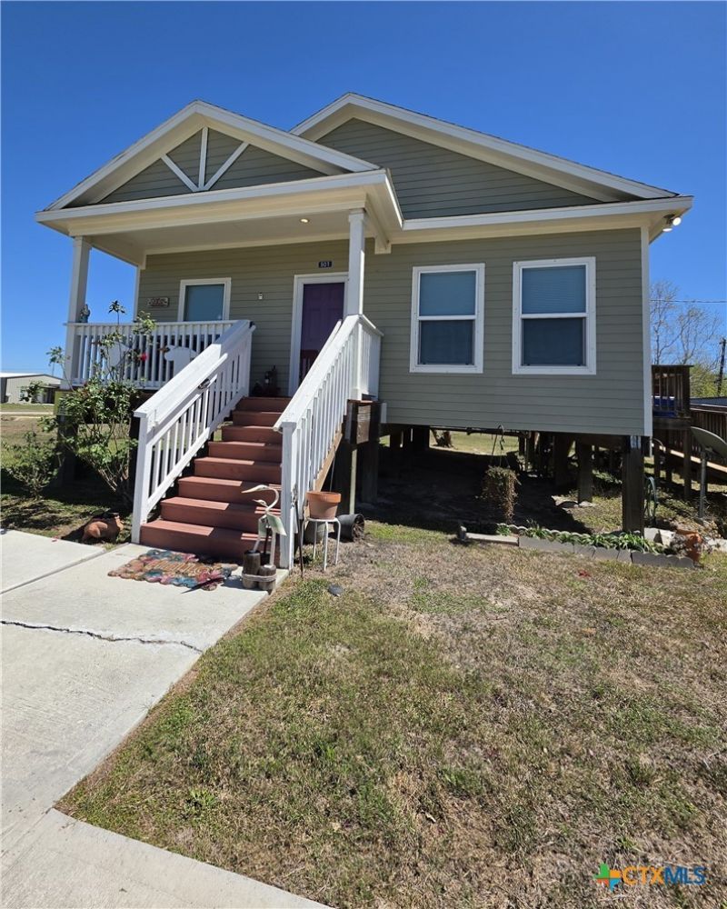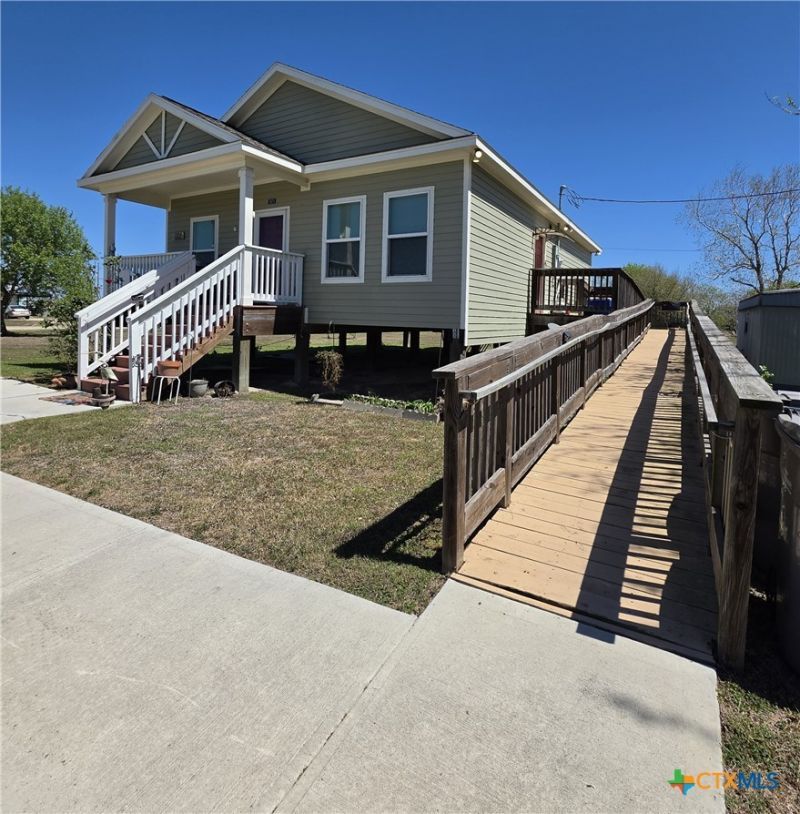 PRICE ADJUSTMENT!! (2020) built, hardi on piers, all electric home on three lots at corner of 13th St. & Dallas Ave.; with 1064sqft is 2/2 unit. Open concept living/dining room, breakfast bar, appliances, in-house laundry (washer.dryer DO NOT convey) w/exterior exit accessed by handicap ramp. Covered front & rear porches. Storage shed, paved driveway facing 13th St. A second driveway is onto Lot 9 from Dallas Ave. which has plenty of room for added boat storage or RV area, with a service pole in place & has utilities available in the alley (not installed). Location is approximately 1000' from Bayfront Park, minutes to lighted fishing pier & walking trail...and City Harbor boat ramp access. Community has paid police services, volunteer fire/EMS, library, public utilities, golf cart friendly, and minimal traffic! and is located on San Antonio Bay, which is a popular sports fishing, duck hunting and birding destination. This 2-lot package gives you room for all the pets and toys!!
