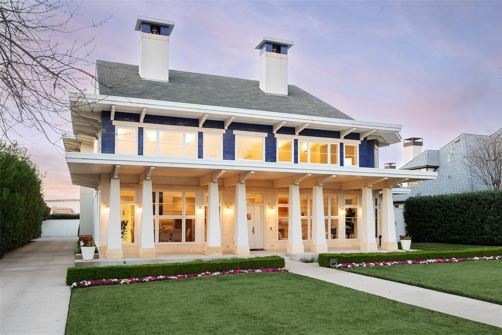 This innovative interpretation of the classic Craftsman home at 6215 Norway carries an air of the resort lifestyle of the Hamptons or Seaside, Florida. Chosen for the AIA Dallas Home Tour in 2023, it is one of only a handful of homes with a private access gate to the St. Mark’s campus. The convenience and privacy this location offers are truly exceptional. Designed by architect Michael Malone and built by Manning Snelling, the 6,886 square foot, 5 bedroom, 6.1 bathroom residence is set on an extra-deep 100 x 200 lot. Malone drew inspiration from C.F.A. Voysey, and Frank Lloyd Wright to create this timeless look. Thick tapered columns, and the large gabled front porch, create an immediate sense of invitation. A blue frieze line of tile at the top of the offers a memorable design element. An environmentally sound home, each major interior space has a corresponding exterior area, allowing for a continuous flow of light. A uniform set of finishes, including Carrera marble and white oak floors, is used throughout the house. Traditional and modern elements are beautifully balanced. Classic open living and dining rooms offer a unique twist, a grid pattern as a unifying design motif. The decorative grid paneling continues in the two-story family room, where a butler’s pantry and a wine room are tucked behind the open-plan kitchen. The primary wing ceiling extends the grid pattern in a streamlined industrial touch, with French doors opening to the pool. The principal bathroom is wrapped in marble with a large shower and a vessel tub. Upstairs are four generously sized ensuite bedrooms – two that offer incredible panoramic views onto St. Mark’s campus. A playroom and exercise room complete the upstairs. With 1,200 square feet of outdoor living space, featuring a covered patio with a fireplace and grill station, a large grassy area, and a pool and spa, this is an ideal environment for both daily living and entertaining. A 3-car garage with room for lifts completes the home.