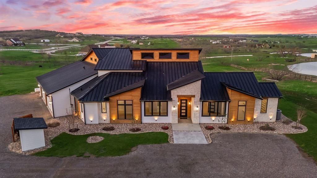 Welcome to this beautifully crafted custom Hill Country modern home set on over 5 acres, offering more than 3,600 square feet of thoughtfully designed living space with breathtaking views of the surrounding countryside. Designed for both everyday living and entertaining, the home features soaring 20-foot ceilings throughout the main living areas, creating a bright and airy open concept layout. The spacious living room showcases a dramatic floor to- ceiling stone fireplace, custom built ins, and expansive sliding doors that open to the outdoor living space. The gourmet kitchen is a true centerpiece, featuring high end appliances, an oversized island, custom cabinetry, and a large walk-in hidden pantry with prep area great for entertaining. The luxurious primary suite offers a peaceful retreat with private patio access, coffee bar, and a spa-like bath with dual vanities, designer finishes, and a soaking tub. Three large secondary bedrooms each include their own ensuite bathrooms, while a fourth bedroom can easily serve as a private office or flex space. Two additional half baths provide convenience for guests. Upstairs, a spacious game room overlooks the main living area and leads to a large covered balcony—perfect for enjoying panoramic Texas sunsets and wide open views. The covered outdoor living area features a built-in kitchen and grilling space, ideal for entertaining. Built with energy efficiency in mind, the home includes 2x6 construction, spray foam insulation, energy-efficient appliances, and Energy Star-rated HVAC systems for year-round comfort and savings. An oversized garage provides ample space for vehicles, storage, or workshop needs. Enjoy the privacy and beauty of country living while still being conveniently located near town in this exceptional Ponder property.