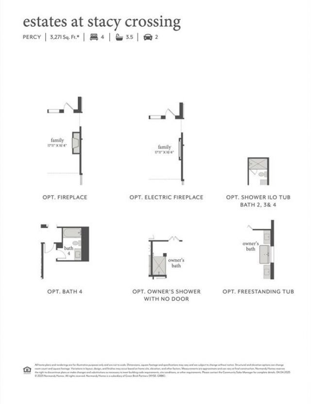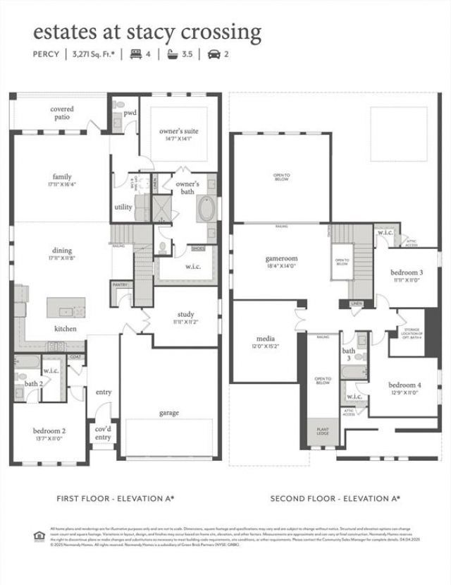 NORMANDY HOMES PERCY floor plan. Discover the Percy, a stunning home boasting 4 spacious bedrooms and 4.5 luxurious bathrooms across nearly 3,300 square feet. The downstairs features a guest room with a private ensuite with a shower ILO of tub, a study, and a gourmet kitchen that opens to a family room with a wall of windows. The private owner's suite includes an ensuite bath with a freestanding tub and a large walk-in closet. Upstairs, you'll find a game and media room, along with two secondary bedrooms, each equipped with walk-in closets. This home is designed for comfort, style, and functionality, perfect for modern living.