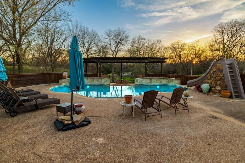 Experience peaceful country living with the convenience of town just minutes away in sought-after Van Alstyne. Situated on approximately 6.44 beautiful rolling acres, this one-of-a-kind custom built home offers 2,878 sqft of thoughtfully designed living space with the perfect blend of comfort, character, country freedom. Inside, you'll find 3 well- appointed bedrooms, 3 full bathrooms, 2 spacious living room areas, formal dining, and a dedicated game room - ideal for entertaining or a 4th bedroom. Hand Scraped hardwood floors add warmth and charm, while granite countertops provide timeless style and durability in the kitchen. The private courtyard is truly an entertainer's dream. Fully stoned for a striking, low maintenance finish, this outdoor retreat features an in-ground pool complete with water slide, water fall with an infinity edge, courtyard island bar designated for hosting and gathering, stone fire pit and an above-ground hot tub for year round relaxation. Whether you're planning summer pool parties or cozy evenings under the stars, this space was built to impress. Bring your animals and enjoy the flexibility of wide-open space with NO HOA restrictions. Wethere you're dreaming of a farm, room to roam, or simply a private retreat in a highly desired location, this property DELIVERS. Rare acreage. Custom design. Prime Van Alstyne location. This is the lifestyle buyers have been waiting for.