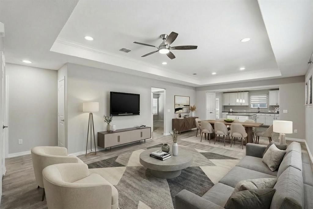 Move-in ready and better than new, this beautifully upgraded and very well-maintained home offers effortless living in a vibrant 55+ community with exceptional amenities. From the moment you step onto the charming front porch and through the upgraded storm door, you are greeted by an open-concept layout grounded by brand new elegant wood-look tile flooring and bathed in natural light. The chef-inspired kitchen features pristine silastone counters, white cabinets, and an island with a breakfast bar. High-tech convenience is woven into the very fabric of the residence, from solar-powered Wi-Fi blinds and dimmable lighting to motion-sensor illumination and a comprehensive whole-house surge protection system for peace of mind. The versatile home office with French doors easily pivots to a 3rd bedroom, while the primary suite serves as a private retreat with a tray ceiling and spa-like bath. A standout feature is the stunning screened porch, off of the bonus indoor sunroom, where you can host cookouts using the integrated gas stub or enjoy the cool breeze of the ceiling fan. It is an ideal space for relaxing, entertaining, or experiencing seamless indoor-outdoor living. Outside, the landscaped yard is fully fenced with a gate on each side and features a custom drainage system to ensure your space remains pristine with minimal effort. With a new roof and every detail from magnetic door catches to smart security already in place, you can bypass the stress of renovation and dive into the lively social scene and world-class amenities that define North Texas living at its finest. Located in a highly sought-after active community, residents enjoy a wide array of amenities and social opportunities including a resort-style pool, fitness room, tennis, pickleball, bocce ball, activity room, coffee bar, miles of trails, a catch-and-release pond, a 35-acre wooded park, food truck park, The Kitch outdoor kitchen, The Porch open-air pavilion, and a dog park.