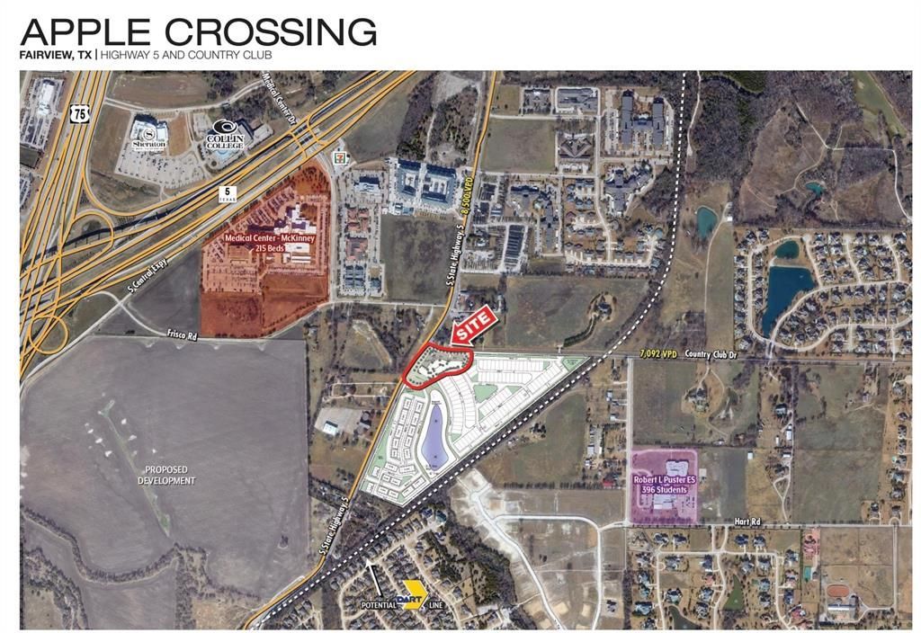 Apple’s Corner is a 2.4 acres retail – office site situated in Fairview, Texas. Zoning allows for up to 25,000 total square feet of retail office space. This property adjoins a 184 homesites development recently sold out comprising new single family homes by Trophy Homes and townhouse’s by CB Jeni. Close proximity to Medical City McKinney, The Villages of Fairview, Fairview Outlet Mall, the Heard Nature Museum, nearby McKinney schools, parks, and many restaurant & entertainment venues. Four way stop light intersection at Highway 5 Greenville Ave. and CR 1378 Country Club Dr. TXDOT and the Town of Fairview are extending Country Club Drive west thereby creating a four corner intersection that will connect to the Highway 75 service road. The Billingsley Development Group has acquired the 242 acres on the west side of Highway 5 and extending to Highway 75 and Highway 121 for a massive planned development community. This property current has all its entitlements and is ready to move dirt!
